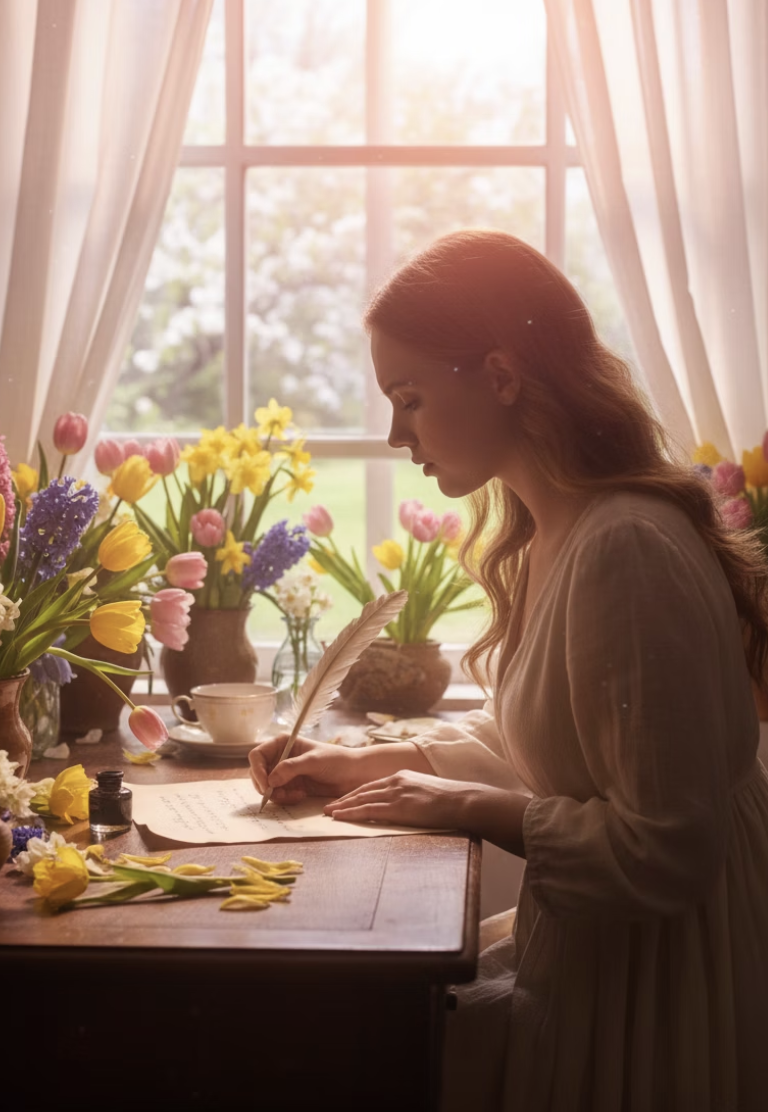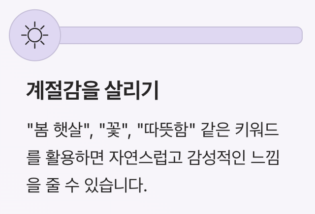 “봄 햇살”, “꽃”, “따뜻함” 같은 키워드를 활용하면 자연스럽고 감성적인 느낌을 줄 수 있습니다.