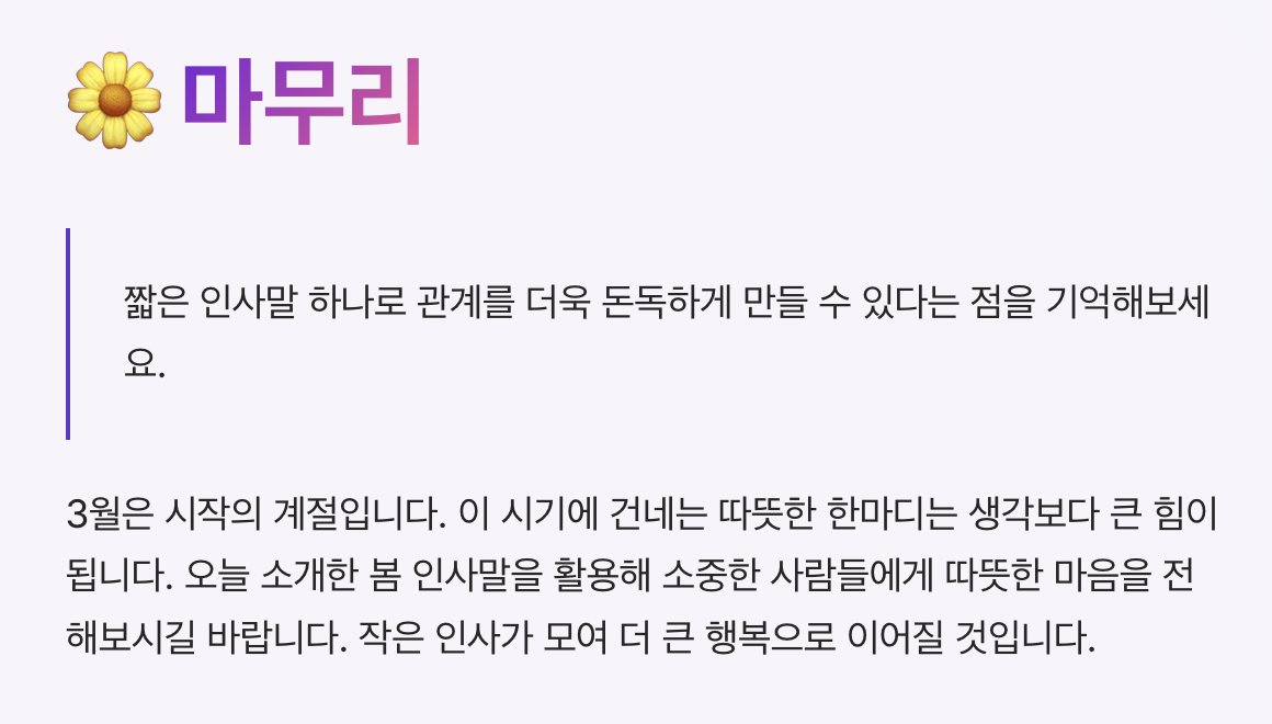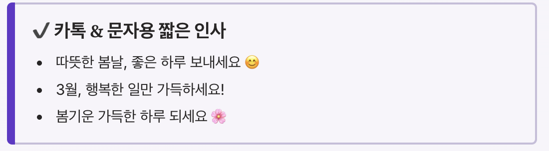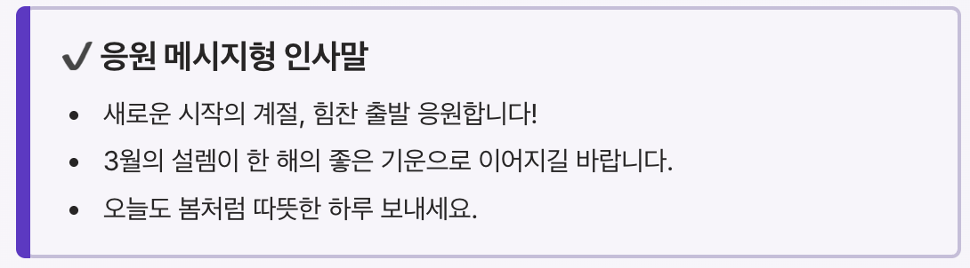| 직장 동료 | 따뜻한 봄 햇살처럼 밝은 에너지로 3월도 힘차게 보내세요! | 밝고 긍정적인 표현 |