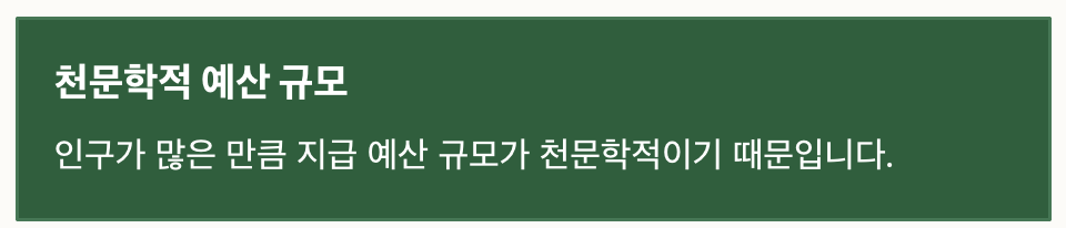 첫째, 인구가 많은 만큼 지급 예산 규모가 천문학적이기 때문입니다.