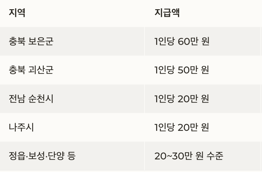 | 충북 보은군 | 1인당 60만 원 | 2026년 상반기 | 30+30 두 차례 분할 지급 예정 |