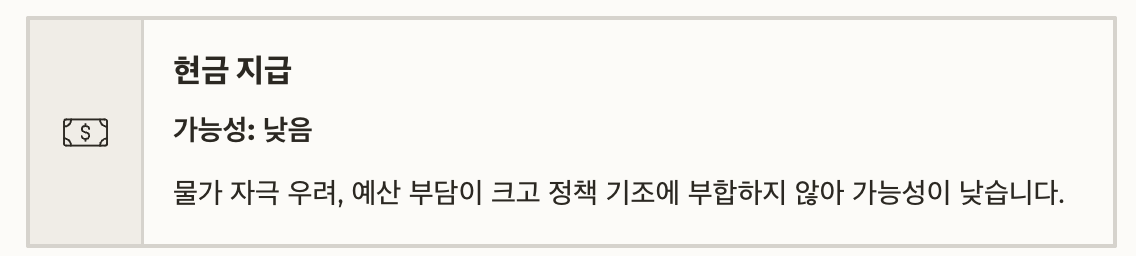 | 현금 지급 | 낮음 | 물가 자극 우려, 예산 부담 크고 정책 기조에 부합하지 않음 |
