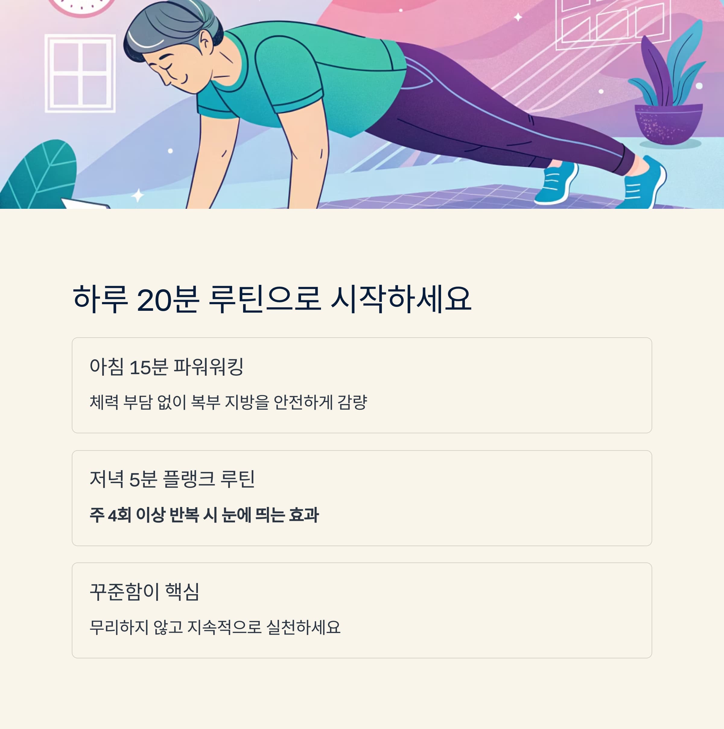 걷기는 심폐 기능을 개선하고, 코어 운동은 뱃살과 허리둘레를 줄이는 데 필수입니다.