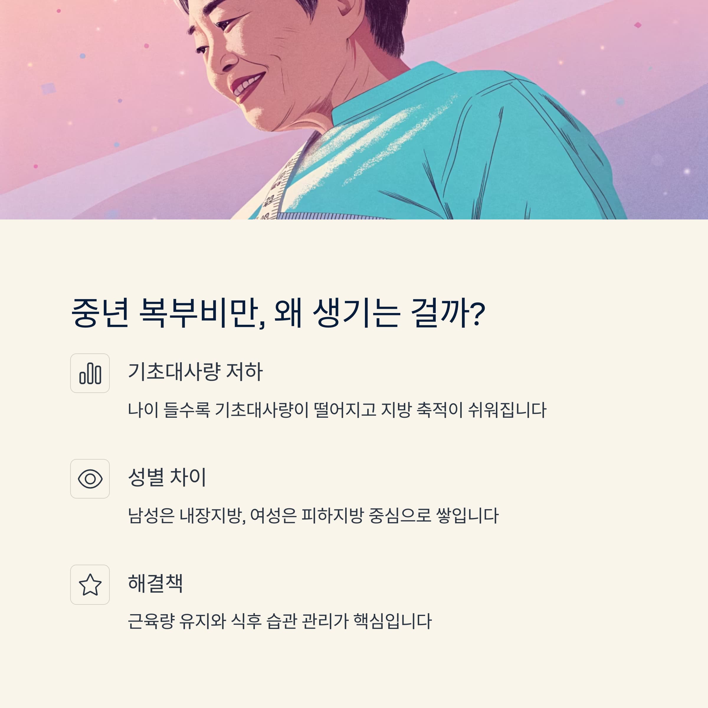 중년이 되면 기초대사량이 감소하면서 복부 비만이 빠르게 진행됩니다.