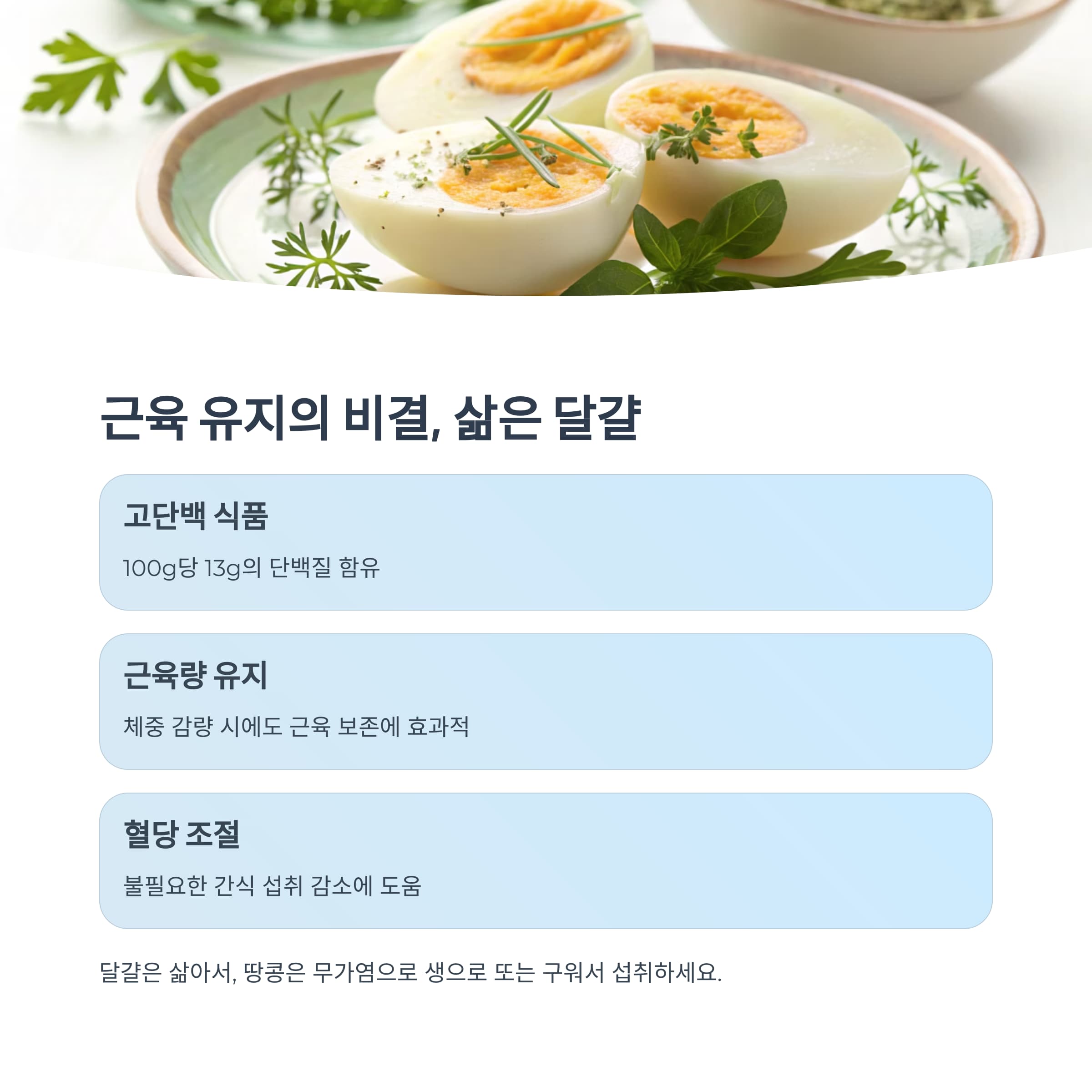 특히 삶은 달걀은 혈당 조절까지 도와주며, 운동 전후나 아침 식사 대용으로 적합합니다.