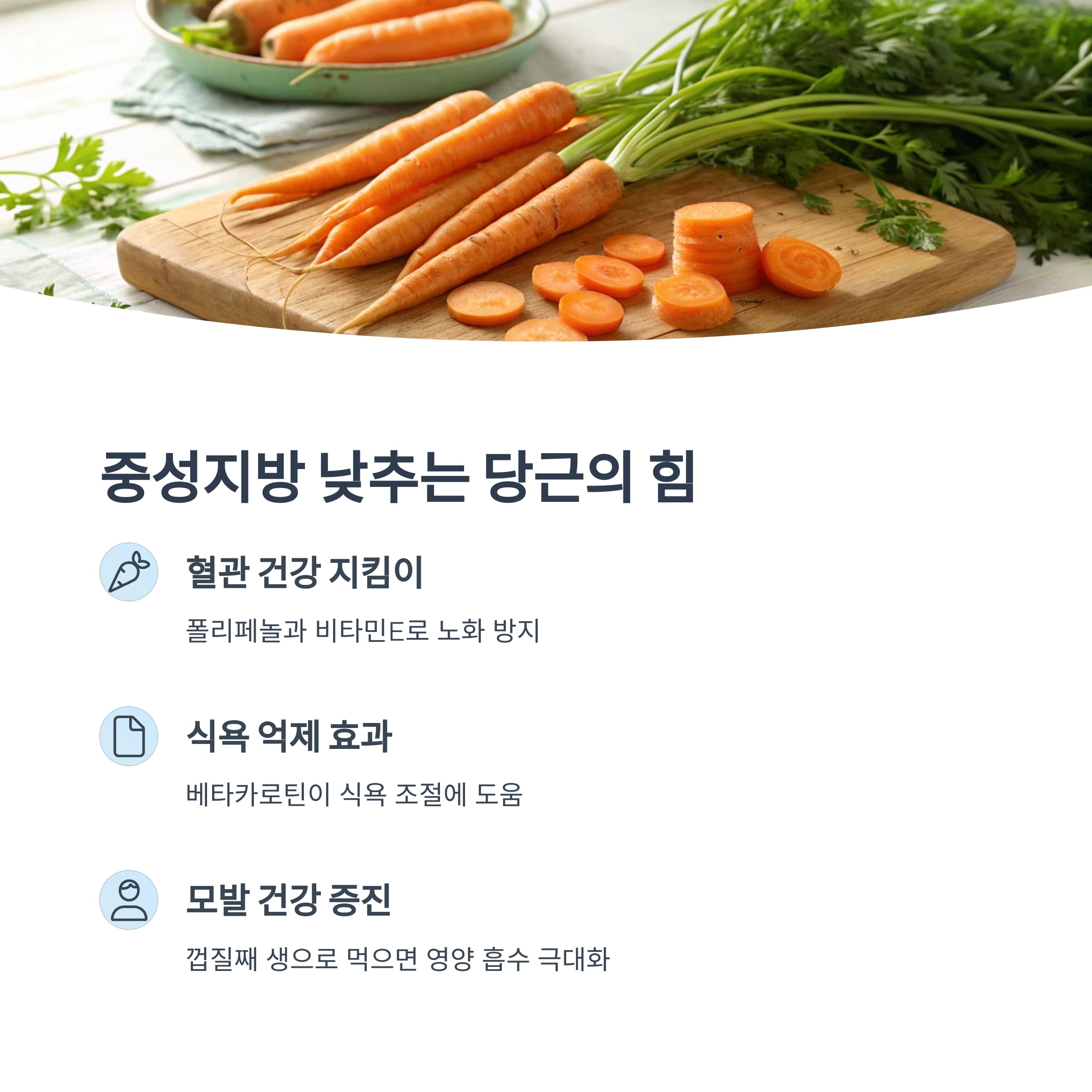 | 당근 | 중성지방 감소, 모발 건강 | 생으로, 껍질째 섭취 |