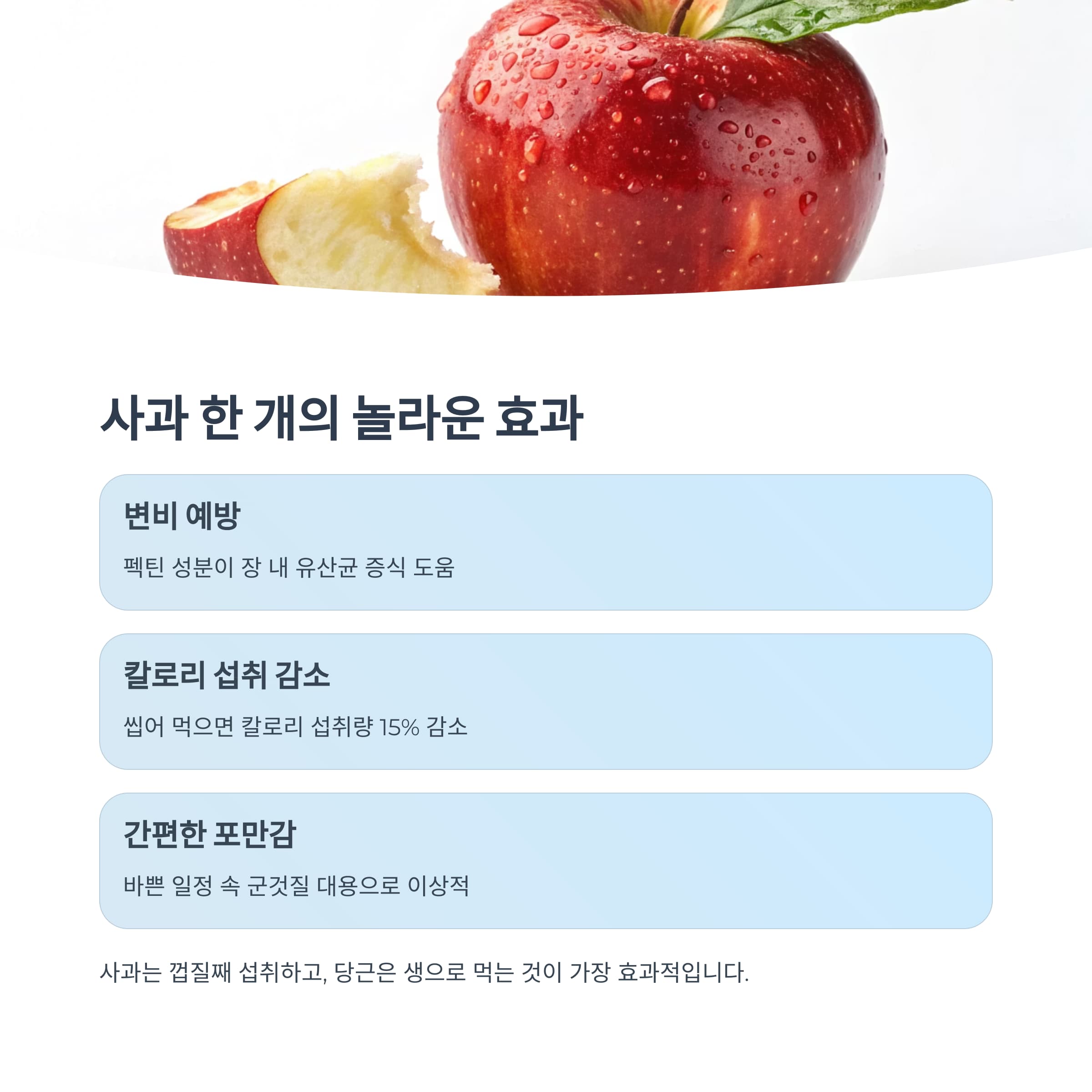 | 사과 | 변비 예방, 식욕 억제 | 껍질째 섭취 권장 |