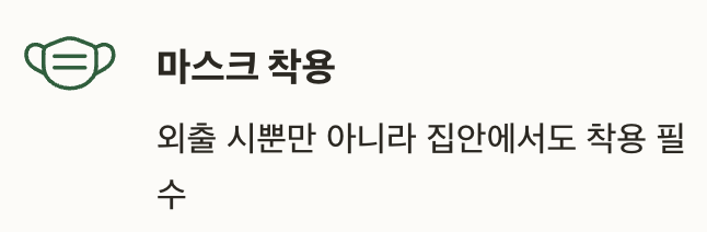 | 마스크 착용 | 외출 시뿐만 아니라 집안에서도 착용 필수 |