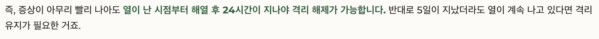 즉, 증상이 아무리 빨리 나아도 열이 난 시점부터 해열 후 24시간이 지나야 격리 해제가 가능합니다.