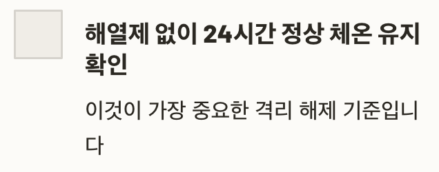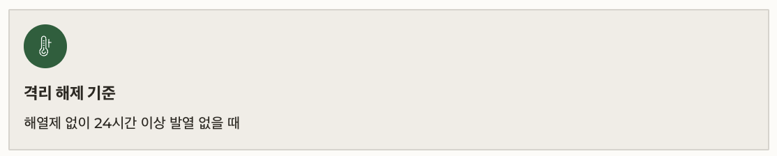 | 격리 해제 기준 | 해열제 없이 24시간 이상 발열 없을 때 |