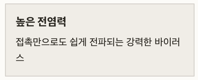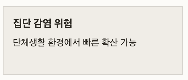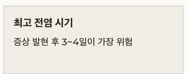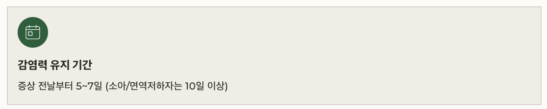 | 감염력 유지 기간 | 증상 전날부터 5~7일 (소아/면역저하자는 10일 이상) |