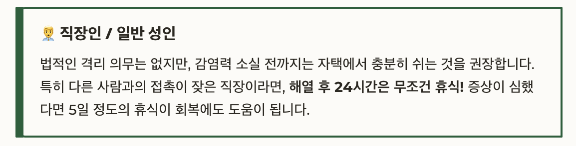 | 권장 격리 기간 | 증상 시작 후 5일 |