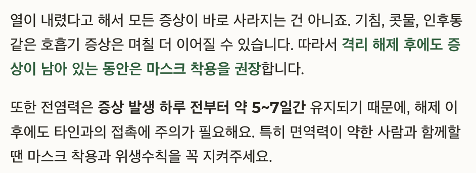 즉, 증상이 아무리 빨리 나아도 열이 난 시점부터 해열 후 24시간이 지나야 격리 해제가 가능합니다.