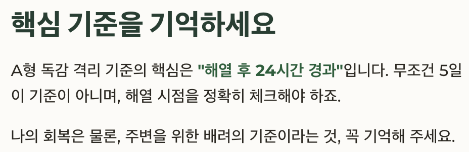 | 해제 시점 요약 | 1. 5일 + 해열 24시간 or 2. 해열 24시간 단독 충족 시 |