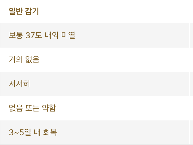 | 통증 | 거의 없음 | 근육통·두통·관절통 동반 |