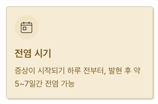 - 전염 시기: 증상이 시작되기 하루 전부터, 발현 후 약 5~7일간 전염 가능