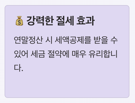 연말정산 시 세액공제를 받을 수 있어 세금 절약에 매우 유리합니다.