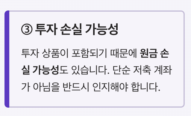 투자 상품이 포함되기 때문에 원금 손실 가능성도 있습니다.