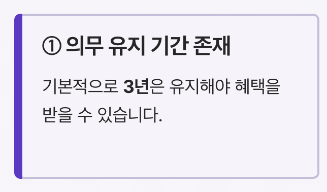 기본적으로 3년은 유지해야 혜택을 받을 수 있습니다.