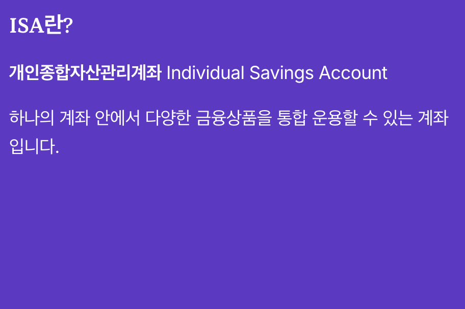 ISA는 개인종합자산관리계좌(Individual Savings Account)의 줄임말입니다.