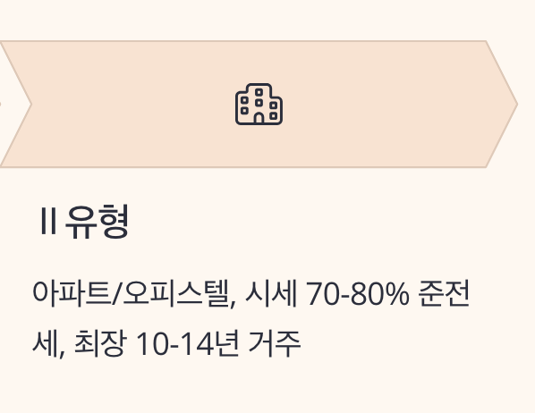 30-40% 수준에 최장 20년까지 거주 가능하며, Ⅱ유형은 아파트또는 오피스텔 형태로 시세 70-80% 준전세 방식으로 공급되어